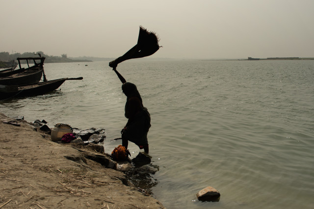 A few kilometers upstream from Haque, the river runs right below Arati Mandal’s house. It is her fourth home – a weak floppy bamboo and khod (a kind of reed) construct with little in it except some pots, a kettle, a bundle of clothes.